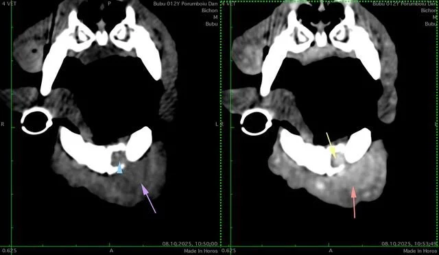 Bubu a ajuns la clinica QincyVet cu o formațiune vizibilă la nivelul mandibulei. La prima vedere, nu părea dureroasă, însă investigațiile au arătat că problema era mai serioasă decât părea.